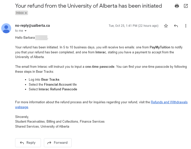 Upon approval of your refund from the University of Alberta, you will receive an email from the university confirming that your refund has been issued.