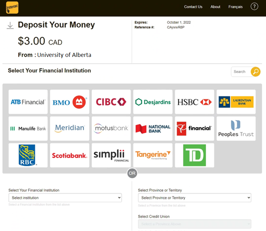 Note: Once you receive the Interac e-transfer email communication, you may choose to deposit the funds into someone else’s bank account so long as you have access to their online banking. The Interac e-Transfer email containing the Deposit your Money link will be sent to the ualberta email address on your student account; however, you may enter someone else’s online banking login details to claim the deposit.