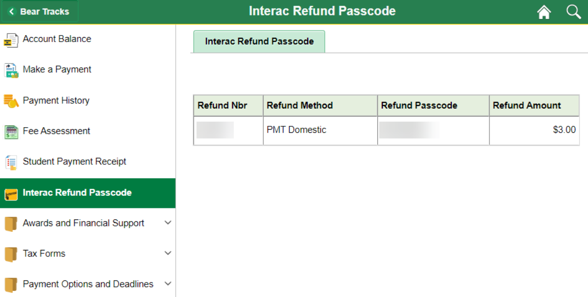 - The Interac e-Transfer email will instruct you to log into Bear Tracks to retrieve your one-time passcode* to securely access and collect your refund payment.