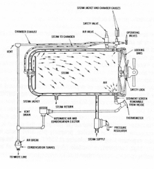 There are several models in the Department of Biological Sciences and the control features can differ. Some of the most common ones are Amsco gravity models that were installed in the 1970's. Gravity refers to the way steam enters from the top of the chamber and forces air out the drain at the bottom (Figure1). The objective is to get all the air out of the chamber and replace it with steam. Other models may use a vacuum to remove air from the chamber before the steam is allowed to enter.