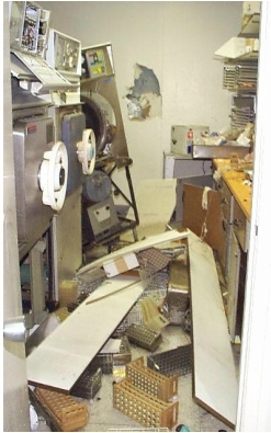 4. The American Industrial Hygiene Association (AIHA) described an incident where a door blew off an Amsco autoclave when it was under pressure. The room was not occupied at the time and no one was injured (Figure 3). The 80 lb door damaged the wall and the autoclave ripped away from the plumbing and electrical connections (assuming a door area of about 400 square inches, at 15 psi the force on that door would be around 6000 pounds). Many test tubes of biohazardous material were smashed in the room. The cause of the door failure was not determined but this is why all autoclaves are inspected annually by the Alberta Boiler Safety Association. There is specific provincial legislation governing the operation of pressure vessels.