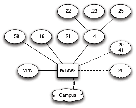 The diagram shows the layout of the department network, with future ugrad portions in dashed parts. Each connection to the firewalls (fw1/fw2) is a point where we can control the type and amount of traffic to and from the networks connected. The subnets 4, 22, 23, and 25 are all controlled as one set.