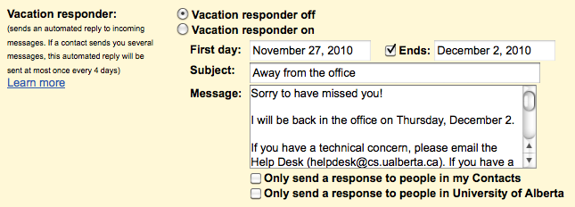 - Be sure to set "Vacation responder on."