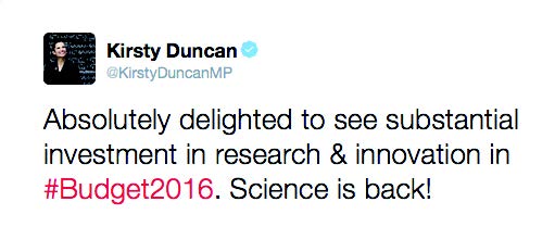 Canada's Minister of Science expresses her excitement on the day of the funding announcement.