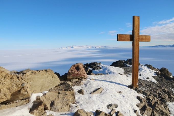 Between the two bases is Observation Hill, and named because it provides a clear view south across the Ross Ice Shelf towards the South Pole. The hill was used by the British Antarctic Expedition to look in vain for Captain Scott and his party on their anticipated return from the South Pole in 1912. The Scott party ran out of food, trapped in a blizzard, some 200 miles south of Ross Island and never returned. A wooden cross was erected at the summit in their memory and, like many things in Antarctica, it reinforces the incredible efforts made by the early explorers. Observation Hill also provides a great view of the green buildings at Scott Base, surrounded by the pressure ridges in the rapidly melting sea-ice.