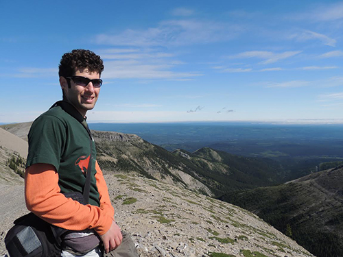 Miller visiting one of the field sites he worked in at Ram Mountain, Alberta. The team hiked the mountains in search of groups of bighorn sheep to observe the animals' interactions. Photo: Jessica Haines.