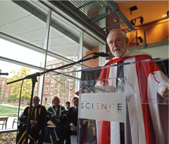 Canada's newest Nobel laureate Arthur McDonald accepting an honorary degree from the University of Alberta in 2011 to coincide with the opening of the Centennial Centre for Interdisciplinary Science