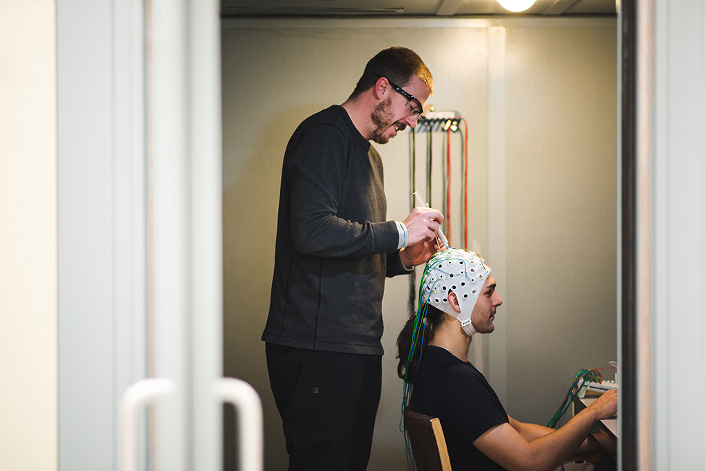 Kyle Mathewson, assistant professor, and Sayeed Kizuk, graduate student, demonstrate the use of EEG technology for studying information processing in the brain. Photo credit: Dawn Graves