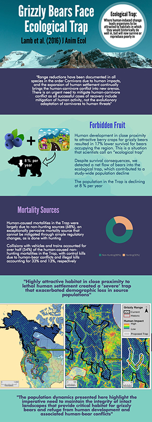 In a new study, Lamb and colleagues analyzed nine years' worth of grizzly detection or capture data and found that the presence of humans has made this area into an ecological trap. This occurs where attractive habitat masks the significant risk associated with the area, creating a mortality sink that has far-reaching effects on the population.