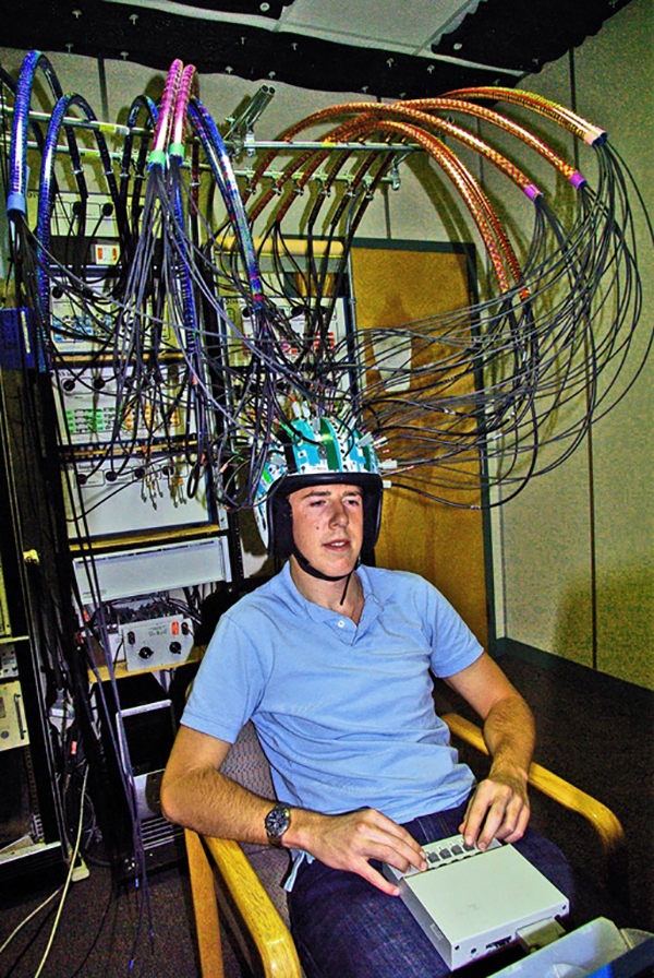 Neuroscientist Kyle Mathewson is pictured here wearing the new optical imaging equipment, called Imagent.