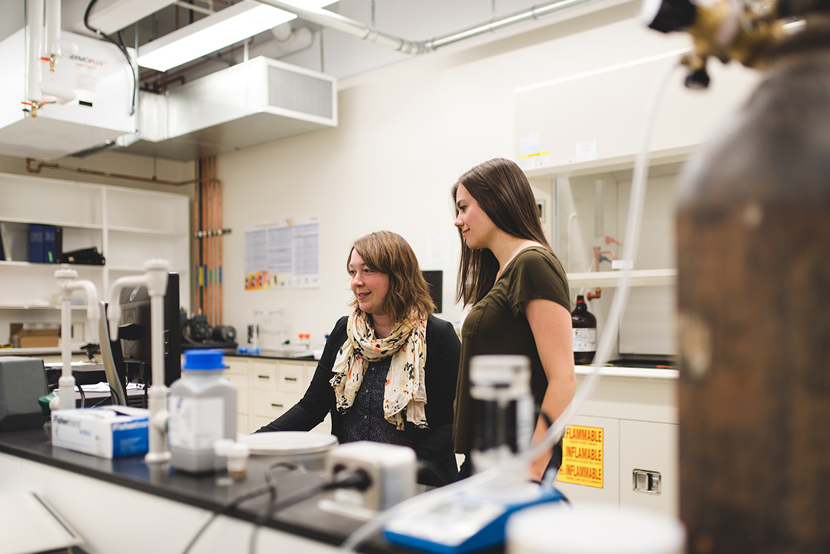 New alumna Stephanie Schneider (right) discovered her passion for environmental chemistry with Sarah Styler (left), assistant professor in the Department of Chemistry, whose research program focused on environmental chemistry. Credit: Dawn Graves
