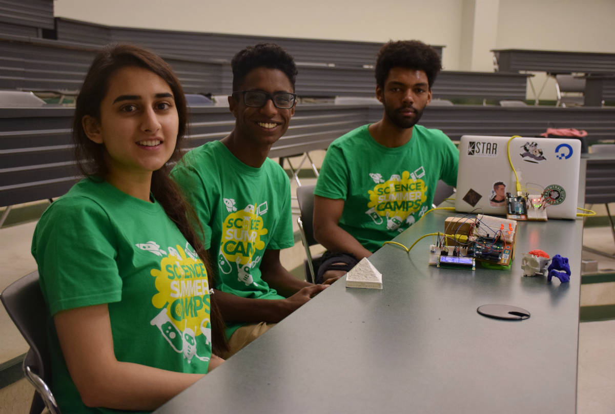 Sameerah Wajahat (L), Yasas Witharana (C), and Tem Tamre (R) welcome campers to the 2018 Science Summer Camps. Photo credit: Michaela Ream
