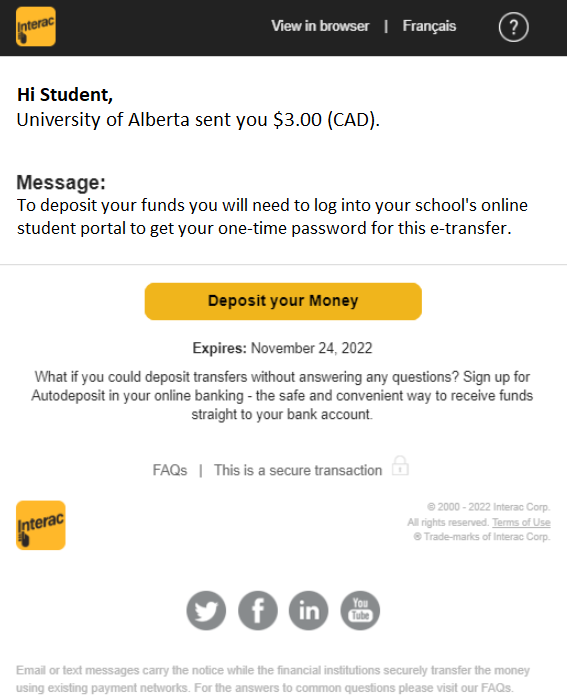 Note: Once you receive the Interac e-transfer email communication, you may choose to deposit the funds into someone else’s bank account so long as you have access to their online banking. The Interac e-Transfer email containing the Deposit your Money link will be sent to the ualberta email address on your student account; however, you may enter someone else’s online banking login details to claim the deposit.