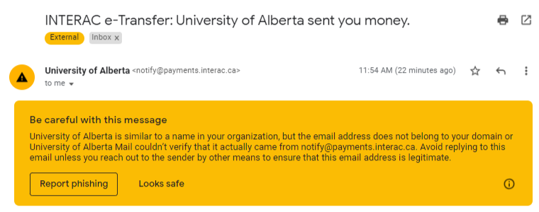When you first receive an email from Interac (notify@payments.interac.ca), your university account may flag the message as a potential phishing email. If this happens, please click on the “Looks Safe” button to help your email recognize it as a legitimate sender. View image of the email you'll receive from Interac.