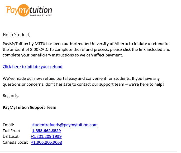 - You will receive an automated email from University of Alberta informing you that PayMyTuition has been authorized to issue your refund. The email will be directed to your preferred email address on file.