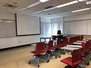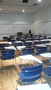 Seating up to 72 in tiered rows of tablet-arm desks, this classroom offers a basic classroom setup augmented with built in whiteboards, a sound system, a projector and projector screen, making it the perfect place for large group presentations and meetings.