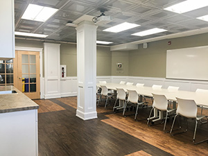Located in the Garden Level of Founder's Hall down the main stair case to the left with French doors and a white interior. The tables can be rearranged to suit your needs.