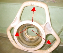 | Figure 5. This shaft has somehow been twisted 90 degrees. If broken, the door can be opened when there is still pressure inside the autoclave. | Figure 6. Marks on the inside of the door wheel from a lever used to force the wheel to turn |