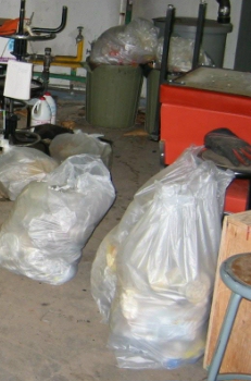 Bags of waste can be disposed of by you into the green dumpster at the loading dock. Remove or deface any biohazard labels since the material should not be biohazardous. Do not abandon bags of waste in the autoclave room or place it in a green garbage can for Building Service workers. They are instructed not to touch any material that appears to be biohazardous.