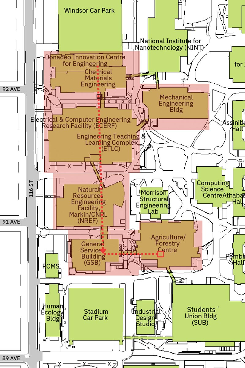 This route runs from the Donadeo Innovation Centre for Engineering (DICE) through the Chemical Materials Engineering Building to the Electrical & Computer Engineering Research Facility (ECERF) and Engineering Teaching & Learning Complex (ETLC). Another branch of the route runs from Mechanical Engineering building to ETLC. From ETLC it connects with the Natural Resources Engineering Facility (NREF) and through the General Services Building (GSB) to the Agriculture/Forestry Centre.