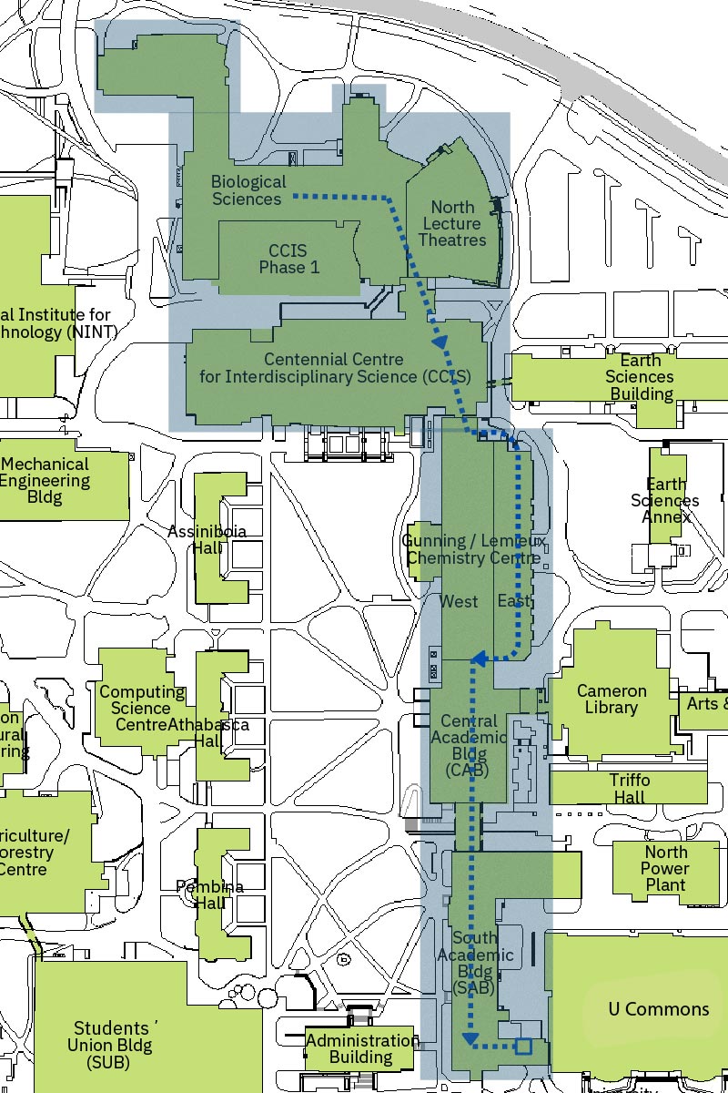 This route runs from the Biological Science Building through the North Lecture Theatres to Centre for Interdisciplinary Science (CCIS). From there it runs through the east side of the Gunning/Lemiuex Chemistry Centre to the Central Academic Building (CAB) to the South Academic Building (SAB).