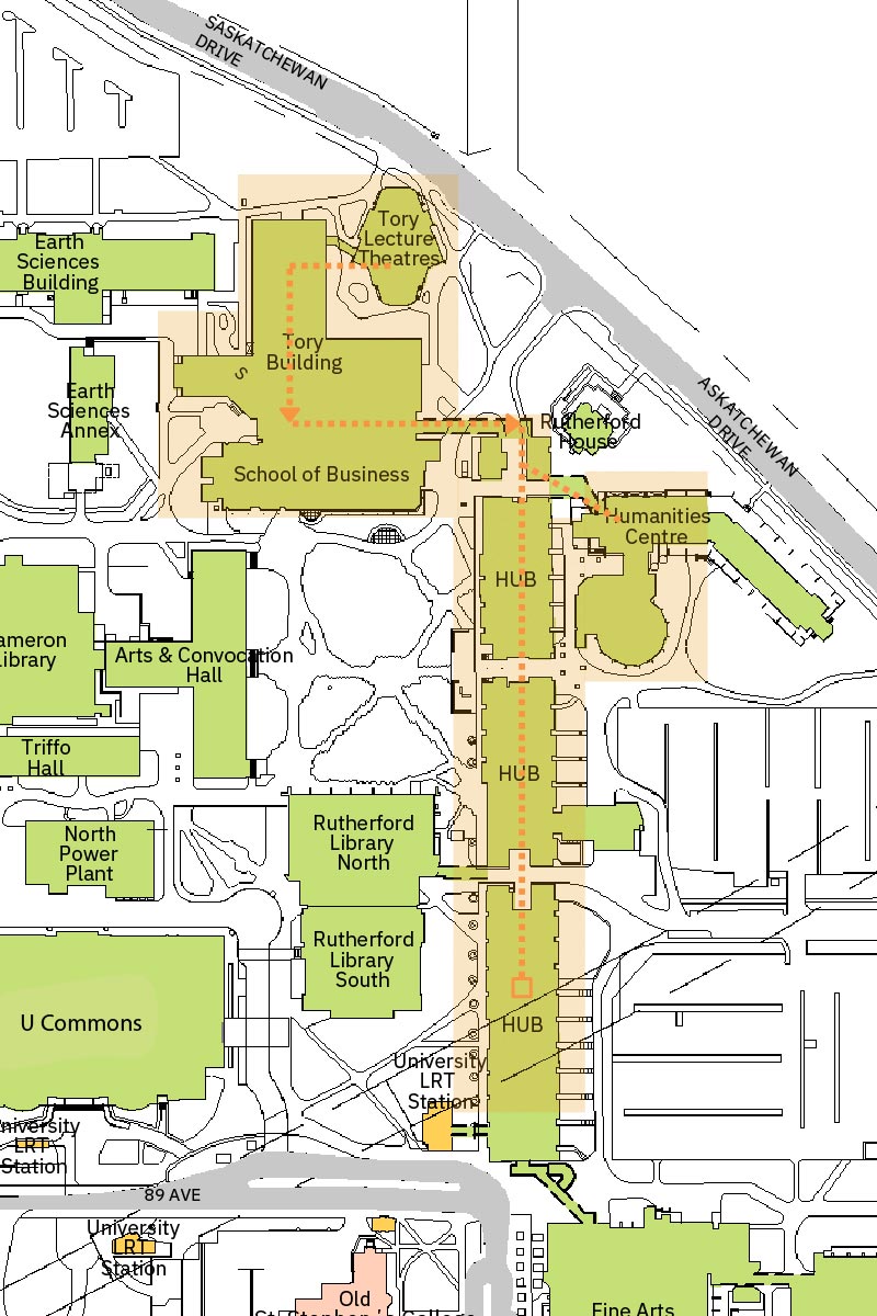 Runs from the Tory Lecture Theatres through the Tory Building to the School of Business. From there it connects to the Humanities Centre and HUB. Note that construction will block access to HUB. Learn more about access to the Henry Marshall Tory Building and Alberta School of Business Building during renovation work.