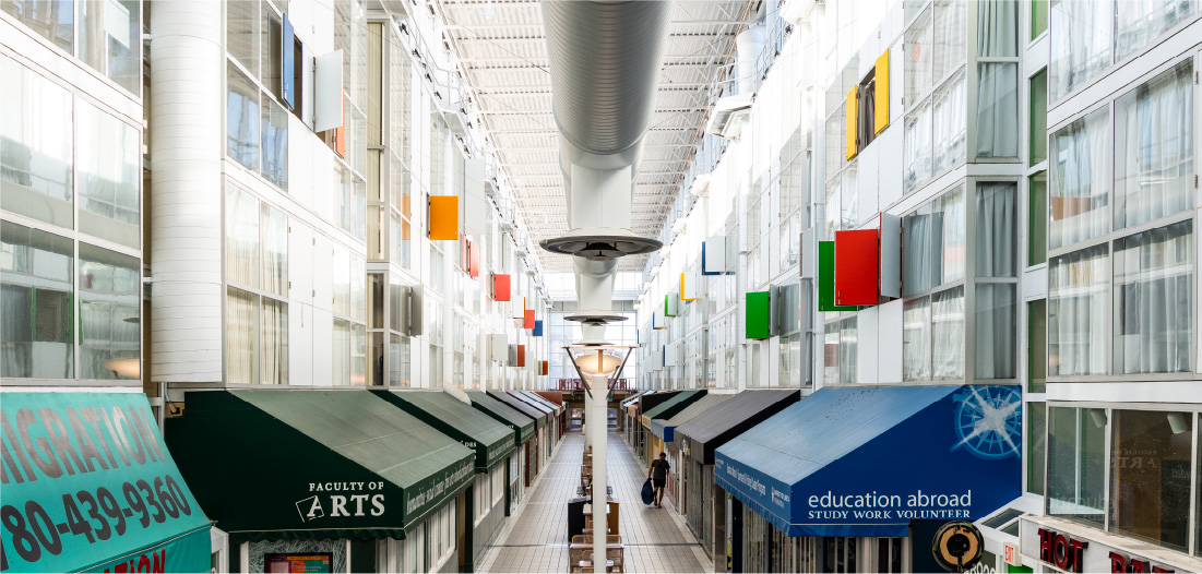 The Students' Union Building is the headquarters of busy campus life, with a major food court, bookstore, pharmacy, print shop, campus pub, convenience store and health centre, as well many other services and student clubs.