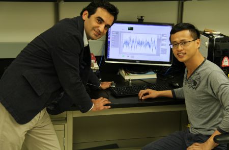 Civil engineering professor Mustafa Gül, seen here inspecting sensors with graduate student Ngoan Do, is leading a new research program to monitor the structural health of railway infrastructure in Canada.