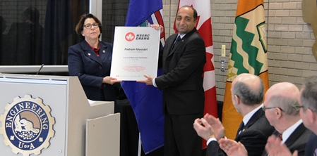 NSERC interim vice president of partnership programs Pamela Moss presents Pedram Mousavi with his NSERC Industrial Research Chair plaque.