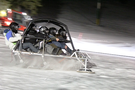 The UAlberta GNCTR team gets up to speed while taking its concrete toboggan on a test run before the national Great Northern Concrete Toboggan Race in Kelowna, B.C., Jan 21-24.