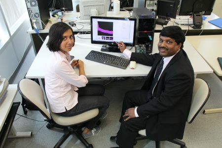 Department of Electrical and Computer Engineering professor Mrinal Mandal and Mitacs Globalink intern Suranjana Samanta review images of skin cancer cells in a tissue sample.