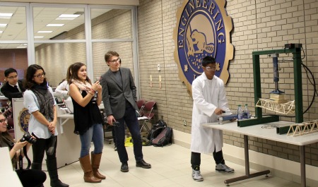 Each of the 30 student teams and a handful of professional engineering teams received a standard package of 100 Popsicle sticks, a container of glue and specification on the size of their bridges. Today, their creations were put to the test, with hundreds of pounds of pressure being applied to each bridge until each reached its breaking point.