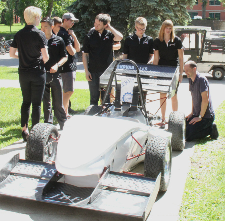 Members of the UAlberta Formula Race team show off the vehicle they designed and built, before heading to an international competition in the U.S.