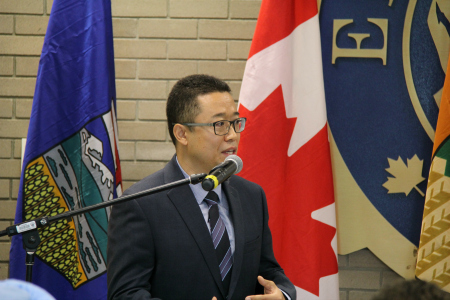 Electrical engineering professor Ryan Li explains his research and thanks federal and provincial government representatives today for new infrastructure funding. Li's smart grids research group-one of the largest in North America-will gain new lab space through the funding.