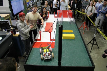 The course student vehicles had to complete was challenging, demanding design that took into account different widths of track with no room for error. Just getting through the entry gate was a challenge for some teams. Once through the gate, vehicles had to cross a teeter-totter, drive up a ramp and complete a 180-degree turn, then push a wooden block into a recessed hole the block would fit into, then scale a steep grade with a very thin area for wheels to fit on. At the top of the pitch vehicles would either fall into a basket of Styrofoam packing or, if the engineers could design for it, the vehicles could be made to support themselves against Plexiglas walls.