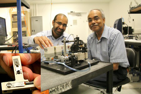 UAlberta Engineering researchers Faheem Khan and Canada Excellence Research Chair Thomas Thundat have worked with collaborators in South Korea to develop a new inexpensive biomedical device capable of identifying proteins. Inset: the microfluidic chip that analyzes samples.