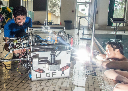 MAKE A SPLASH: Members of the ARVP club adjust their robot before a dive.