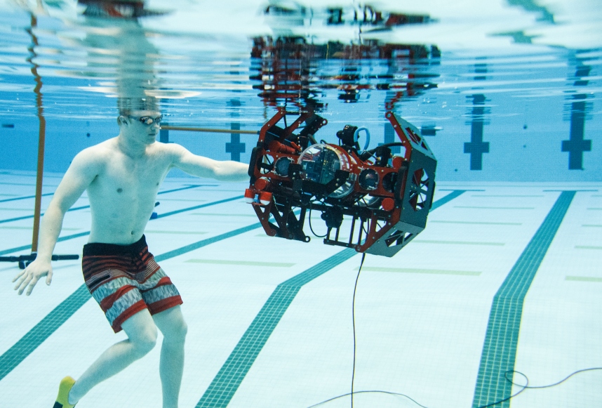 Mechanical team lead Ryan van Drecht swims with upgraded Auri at the launch event on July 7, 2018.
