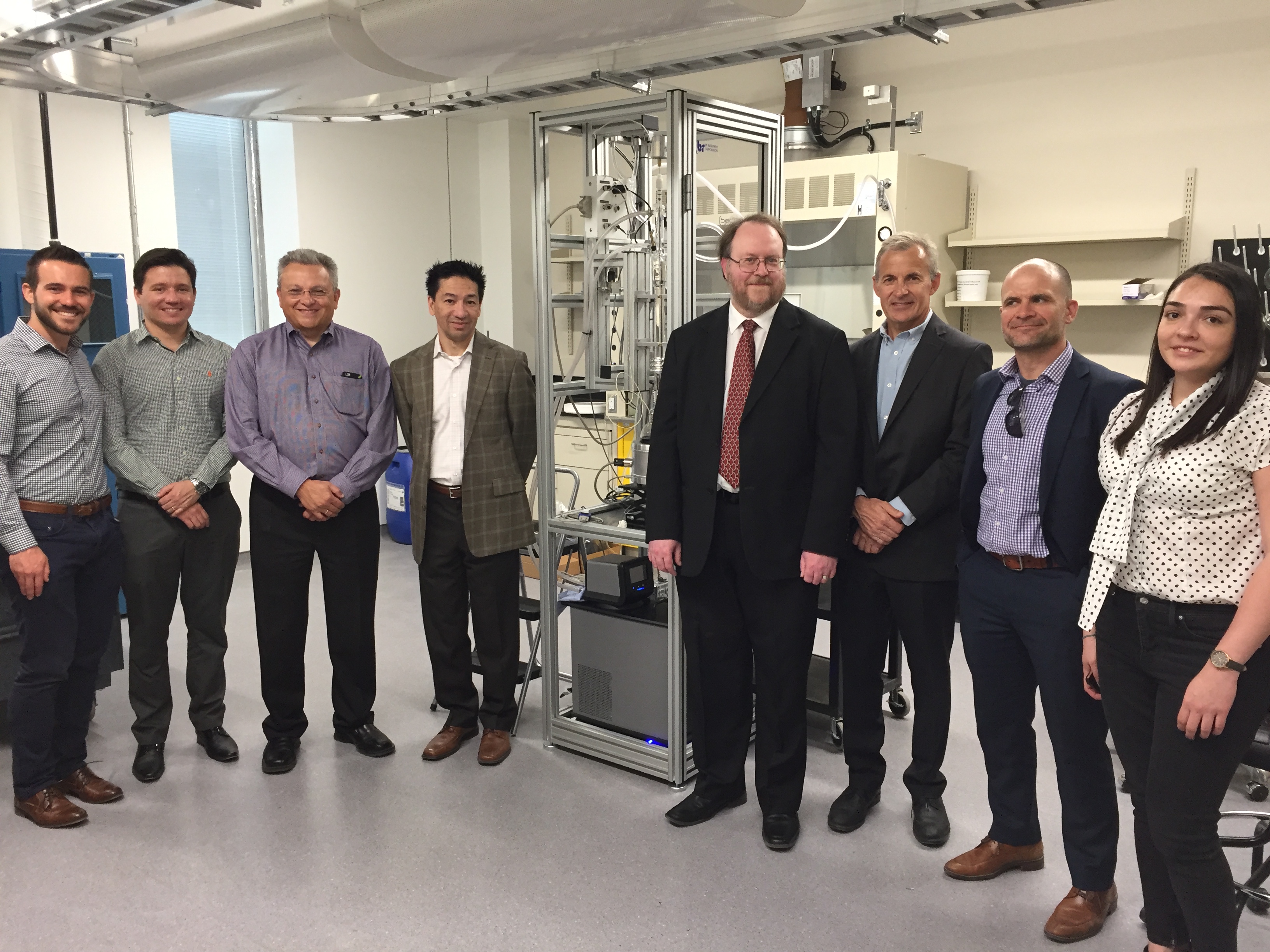 Industrial research chair Arno De Klerk (right centre) with students, Nexen-CNOOC, Alberta Innovates partners, tour his lab. De Klerk's research program is aimed at partial upgrading of bitumen.
