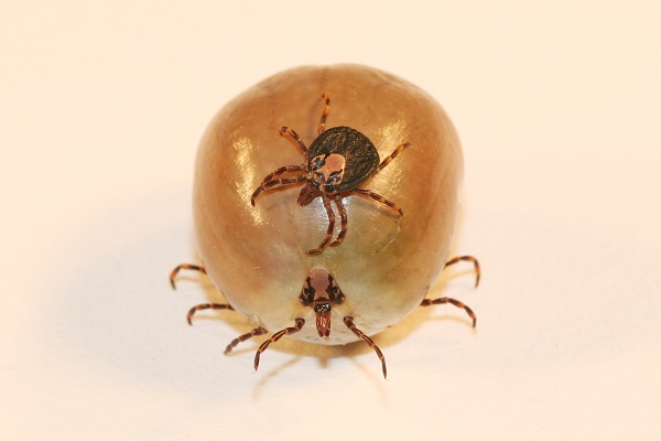 An engorged female tick, nearly 100 times her normal size, carries an unfed counterpart on her back.