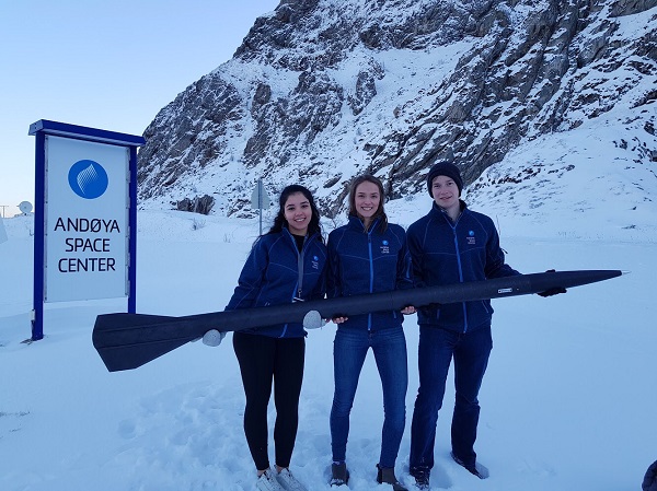 U of A students (l to r) Manel Abjuni, Hannah Parry and Sean Kruszweski with the rocket they launched at Andoya Space Centre, Norway