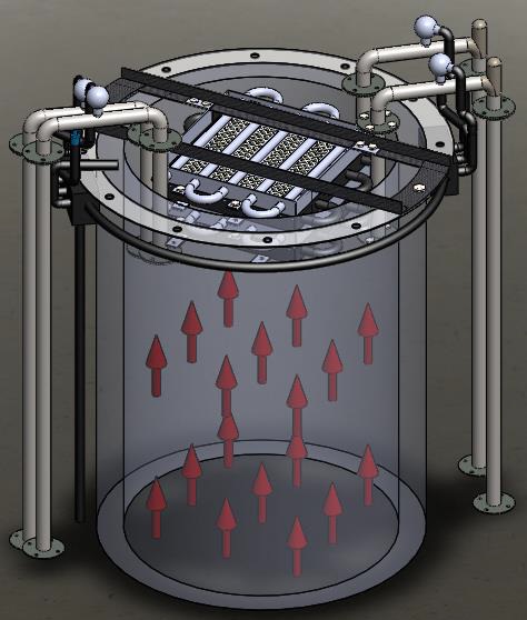 Render of assembled heat exchanger mounted on flare stack, hot gases flow as indicated by red arrows (image credit: Rezaey, University of Toronto)