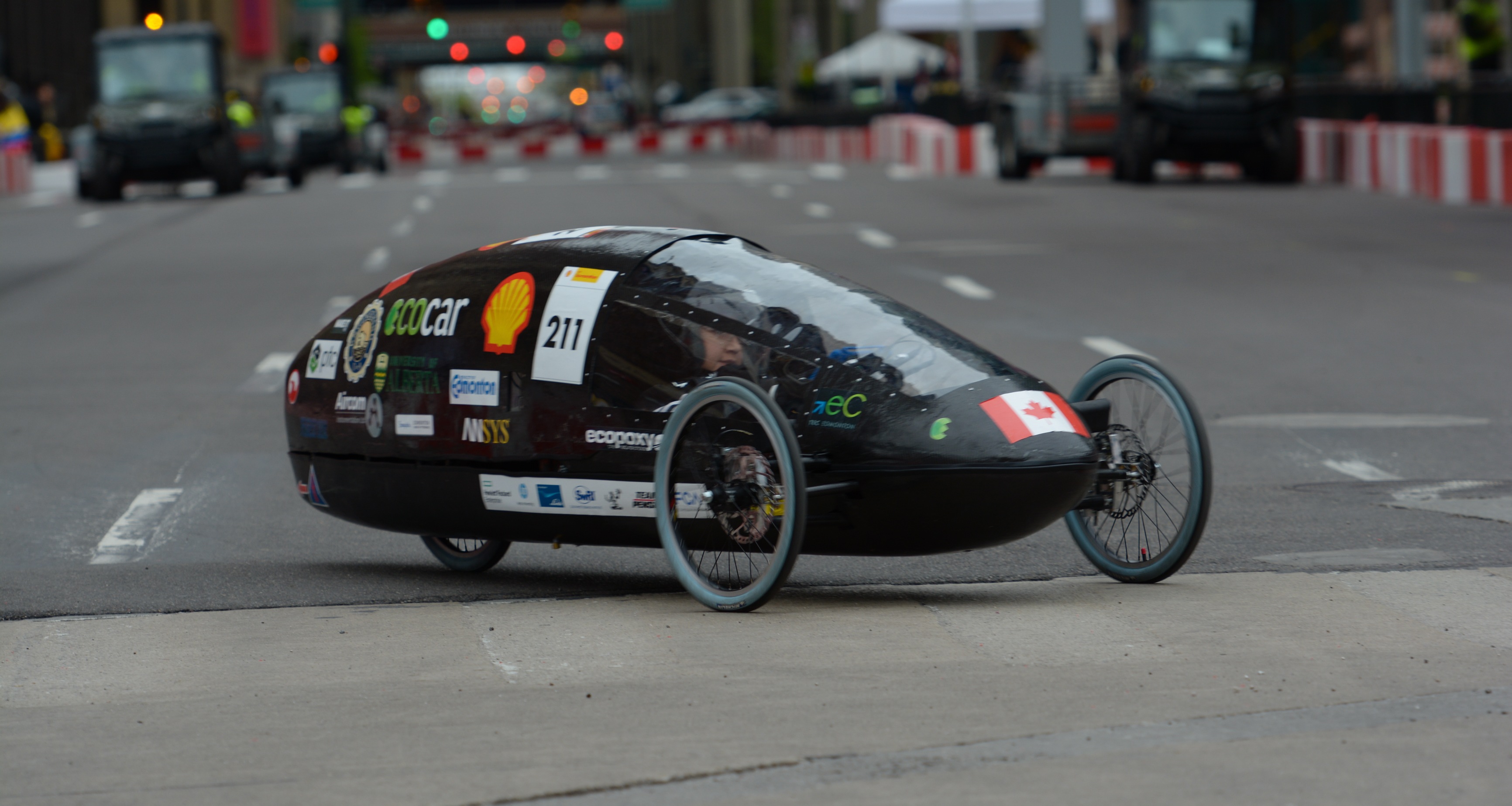 The idea of the Shell Eco-Marathon Americas competition is simple: design and build a car that uses the least amount of energy to travel a set distance. The U of A team's car, named Sofie, competes in the prototype-hydrogen category. With her slick-black carbon fibre shell, skinny tires and an aerodynamic, torpedo-shaped body, Sofie is a single-seat zero-emissions vehicle powered by a hydrogen fuel cell. In previous years, the U of A team vehicles have achieved the energy efficiency equivalent to driving from Vancouver to Calgary on one gallon of gas.