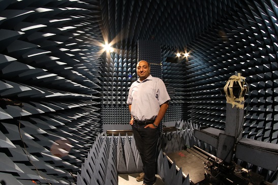 Dr. Mousavi in the University of Alberta's, antenna measurement chamber