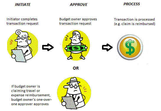 The process steps are Initiate, Approve and Process as shown in the diagram below. The Review step is embedded in the Approve step, as some transactions may be reviewed by the budget owner or may not require review prior to approval.