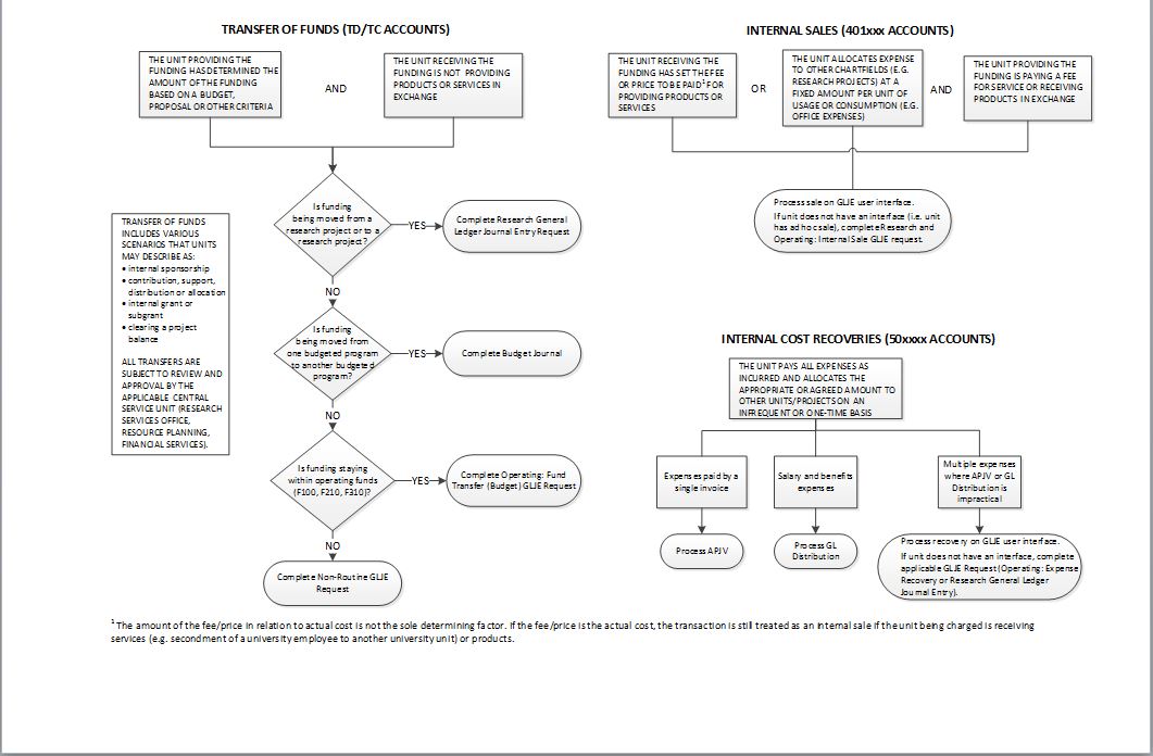 Refer to the Appendix at the end of this section (Distinguishing Between Transfer of Funds, Internal Sales and Internal Cost Recoveries) to assist with choosing the appropriate transaction process.