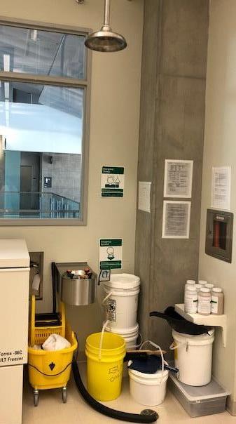 - Obstructed emergency showers or eye wash stations - these are life-saving devices, not storage areas