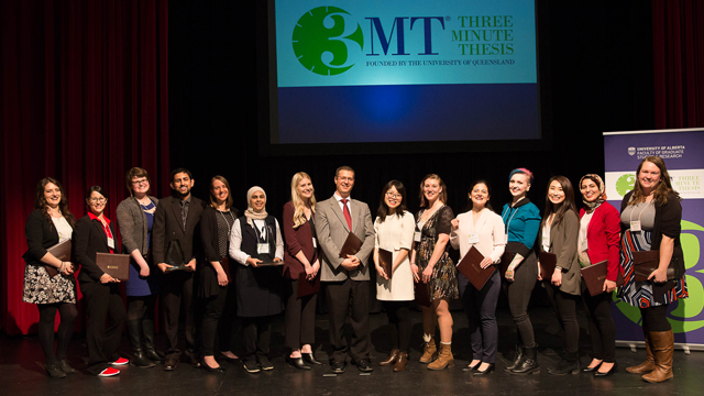 The 2018 Three Minute Thesis (3MT) UAlberta Finals were held at Convocation Hall on Wednesday, April 11. Fifteen talented graduate students took the 3MT challenge and explained the significance of their theses research in three minutes with the use of only one PowerPoint image. These presentations were delivered to an audience at Convocation Hall, and to an online audience who watched the live stream. It was a difficult decision but the following were chosen based on the 3MT criteria of communication style, comprehension, and engagement.