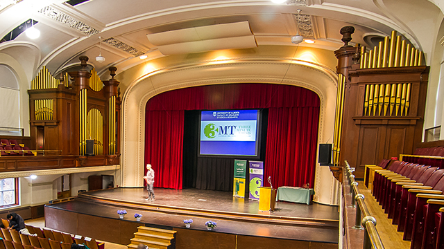 Preparing the stage at Convocation Hall before the 2017 UAlberta 3MT Finals (Photo: Gurveer Chohan)