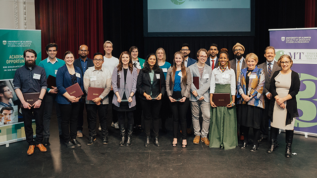 The 2019 Three Minute Thesis (3MT) UAlberta Finals were held at Convocation Hall on Tuesday, March 26. Fifteen talented graduate students took the 3MT challenge and explained the significance of their theses research in three minutes using only one Powerpoint slide. The presentations were delivered to an audience at Convocation Hall, and to an online audience who watched via livestream. The students were judged based on communication style, comprehension, and engagement. After much deliberation and tallying of scores, the following winners were chosen: